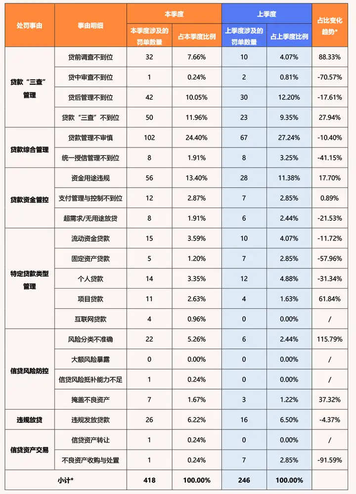 贷款业务领域的处罚主要围绕信贷流程的合规性和风险管理,包括贷前调查、贷中审查、贷后管理的“三查”不到位,以及信贷资产交易、违规发放贷款等行为,覆盖信贷全流程,且关键环节缺陷集中,与第二季度“贷款管理+三查不到位”为主的违规特征高度一致。