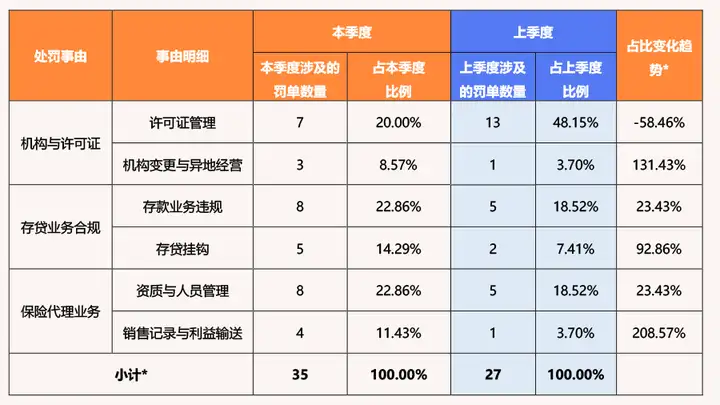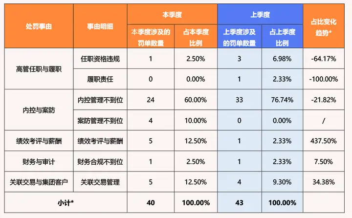 注2:“占比趋势”指本季度罚单数量占比相比于上一季度罚单数量占比的变化百分比