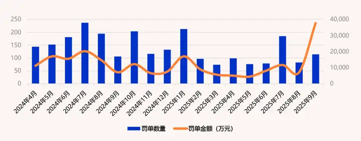 与第二季度相比,2025年第三季度罚单总量为382张,较第二季度环比增长50.39%;第三季度总罚没金额为56442.24631万元,环比增长221.06%。与2024年第三季度相比,罚单总量下降了28.99%,罚没金额增长了34.44%,平均罚没金额增长了89.34%。