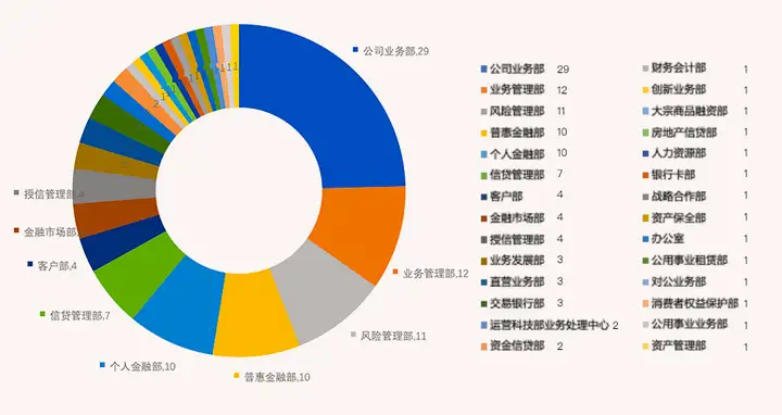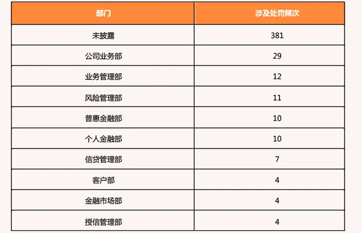 在已披露部门中,业务一线及风险管控相关部门是处罚集中区:公司业务部以29次处罚居首,业务管理部(12次)、风险管理部(11次)、普惠金融部(10次)、个人金融部(10次)紧随其后,这五类部门合计处罚72次,占已明确部门总次数的60%以上。这类部门因直接对接客户、主导业务操作或承担风控职责,个人违规风险暴露概率更高。
