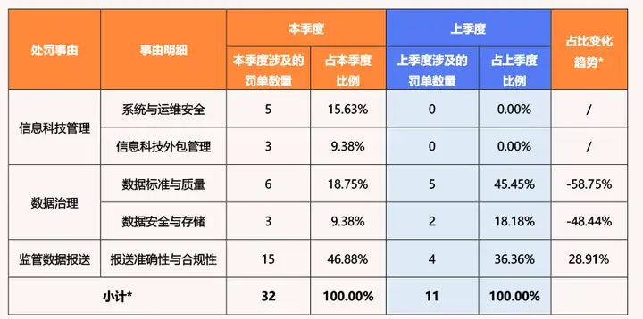 注1:单张罚单可能出现多次不同的信息科技与数据治理细类违规行为,故该表小计数量(32)不等于信息科技与数据治理整个领域涉及的总罚单张数(26)