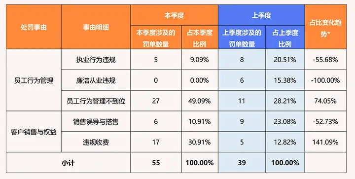 注1:单张罚单可能出现多次不同的客户权益与员工管理细类违规行为,故该表上季度涉及罚单数量小计(39)不等于客户权益与员工管理上季度整个领域涉及的总罚单张数(34)