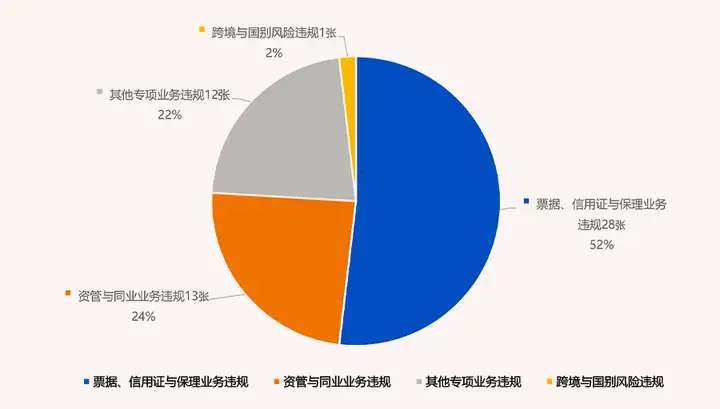 其他罚单数量较少的违规领域主要涵盖票据、信用证与保理业务,资管与同业业务,跨境与国别风险及其他专项业务,均为前文未单独设领域的业务类型。该类违规领域共涉及54张罚单,其中票据、信用证与保理业务违规以28张罚单、51.85%的占比成为该领域最大风险点。资管与同业业务违规紧随其后,涉及13张罚单,占比24.07%,两者合计占据该领域75%左右的违规量,是监管关注的核心。其他专项业务违规涉及12张罚单,占比22.22%,其中包含租赁业务、信用卡业务、股权与押品管理等,体现出合规风险在小众业务领域的分散性。跨境与国别风险违规占比最低,仅1张罚单,说明多数机构在跨境业务风险防控与国别风险管理上相对规范,但随着跨境业务的推进,其潜在风险仍需警惕。