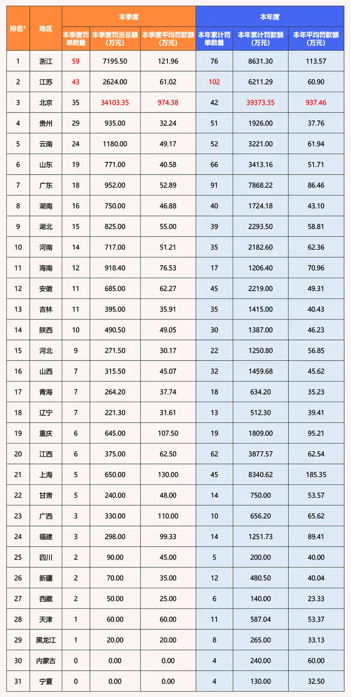 注:第一列的排名仅依据本季度地区罚单数量数据。