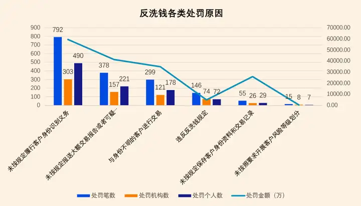 6、“未按规定履行客户身份识别义务”、“未按规定报送大额交易或可疑交易报告”、“与身份不明的客户进行交易”,仍是处罚的重灾区。