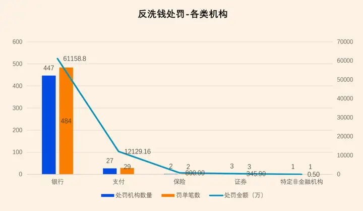 2025年全年被处罚的机构类型包括银行、支付机构、证券机构、保险机构和特定非金融机构。具体情况如下: