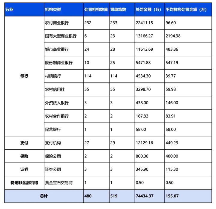 根据每次公示的总行、分行或支行作出的处罚,按照法人机构维度进行统计(例如同一法人机构的多家分行/分公司,归到法人机构进行统计)。