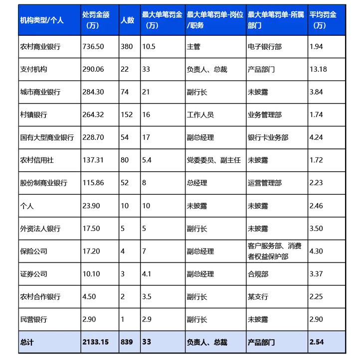 个人罚单金额最高额与最高平均个人处罚金额,均为支付机构。其中,最高个人罚单为某支付机构总裁、产品部门负责人,由于客户身份资料与交易记录保存工作不到位,受到警告,并处罚款33万元。