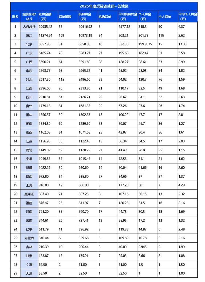1、根据人民银行官网已公示的信息,据不完全统计,除中国人民银行总行外,合计28个省份及直辖市的人民银行各级分支机构行使了反洗钱行政处罚权,2025年全年共对480家义务机构进行了反洗钱行政处罚,处罚金额共计7.65亿元。其中机构罚单数量519笔,罚款金额约7.44亿元,个人罚单数量839笔,罚款金额约2133万元。总计罚单数量1358笔,较2024年增长119%,这一翻倍的增幅,标志着我国反洗钱监管进入了一个更为严格的时代。
