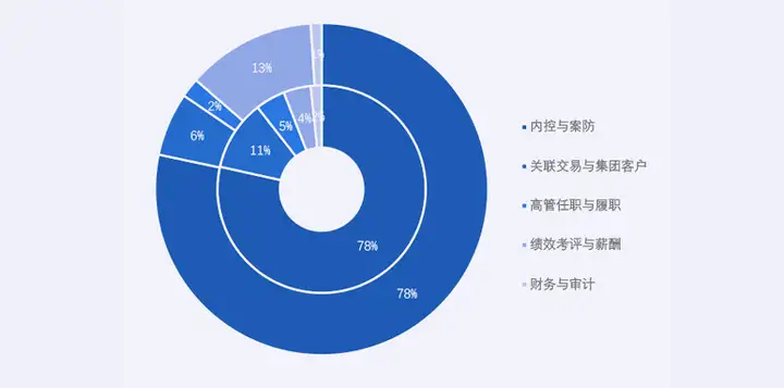 受处罚的中台部门以风险合规部、信贷管理部、授信审批部为主,分别为43次、26次、17次,覆盖了信贷管理和内控管理这两个金融机构受罚的重灾区,体现了机构与个人监管处罚角度的一致性。